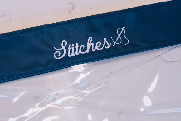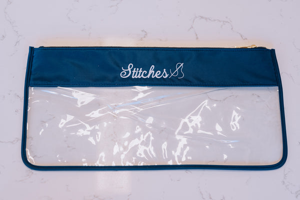 Keep your stitching supplies organized in style with this oversized navy and clear project bag! Measuring 18" x 9", it's the perfect size for canvas, fibers needles, snips and all your stitching essentials. The transparent vinyl panel lets you see exactly what's inside at a glance, while the durable nylon exterior keeps everything protected. Choose between two charming embroidered designs—NDLPT or Stitches—to match your creative personality. Whether you're heading to a stitch night or settling in for a cozy night on the couch, this bag makes toting your supplies a breeze.